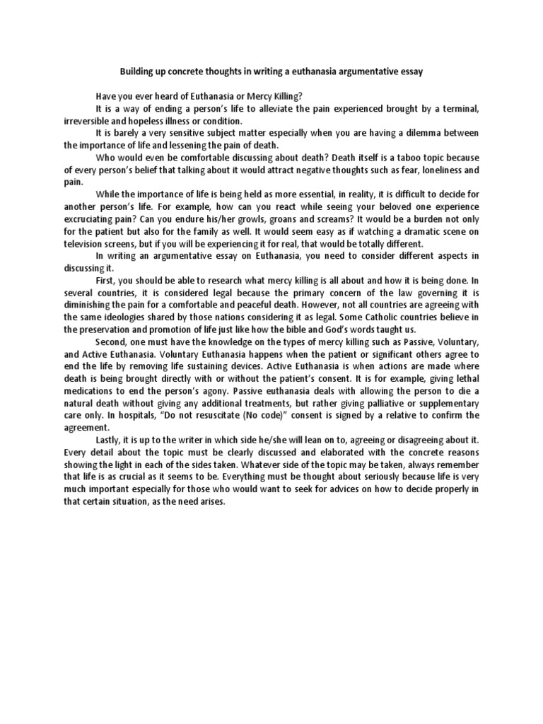 However, the abortion of an unborn child, euthanasia debate essay, who has no say so in their life, is made legal and some deemed ethical. As there are other patients who have a higher chance of living, euthanizing the patient was the more practical option. Euthanasia advocates argue that futile care may harm others. For instance, a young child with an acute respiratory disease, who has a potentially higher chance of getting cured, could not get a bed and ventilator […]. Should any patient who is in these circumstances be allowed to choose death over this life?